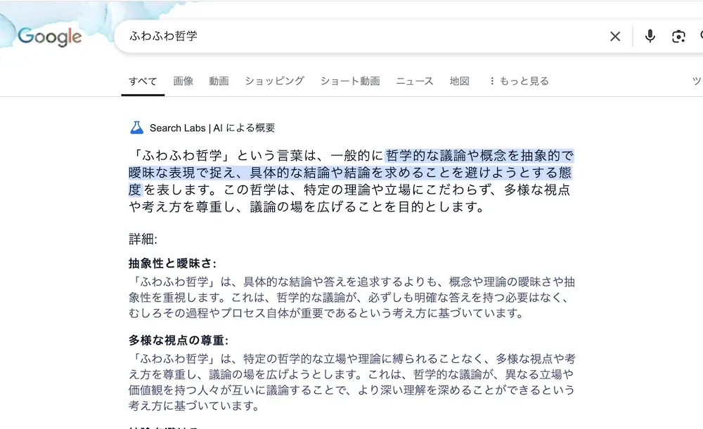 下記は、「ふわふわ哲学」とググった際の25年4月22日現在のSearch Labs | AI による概要です。